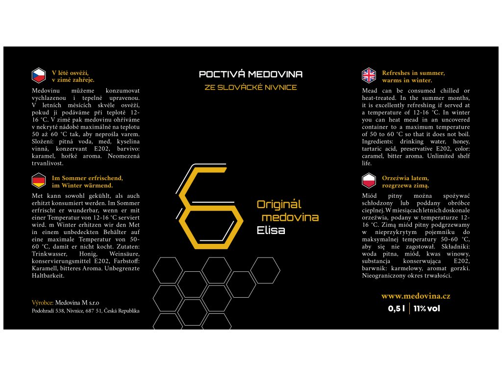 We are the producers of Elisa mead, crafted according to the original recipe for over 50 years. This mead is made exclusively using a cold production method and high-quality Czech honey. After complete fermentation, it matures in deep, climate-controlled cellars. The final filtration is done using modern equipment, giving the drink a crystal-clear appearance and a vibrant sparkle. Elisa mead is made solely from Czech honeys – with no added sugar and no fortified alcohol.